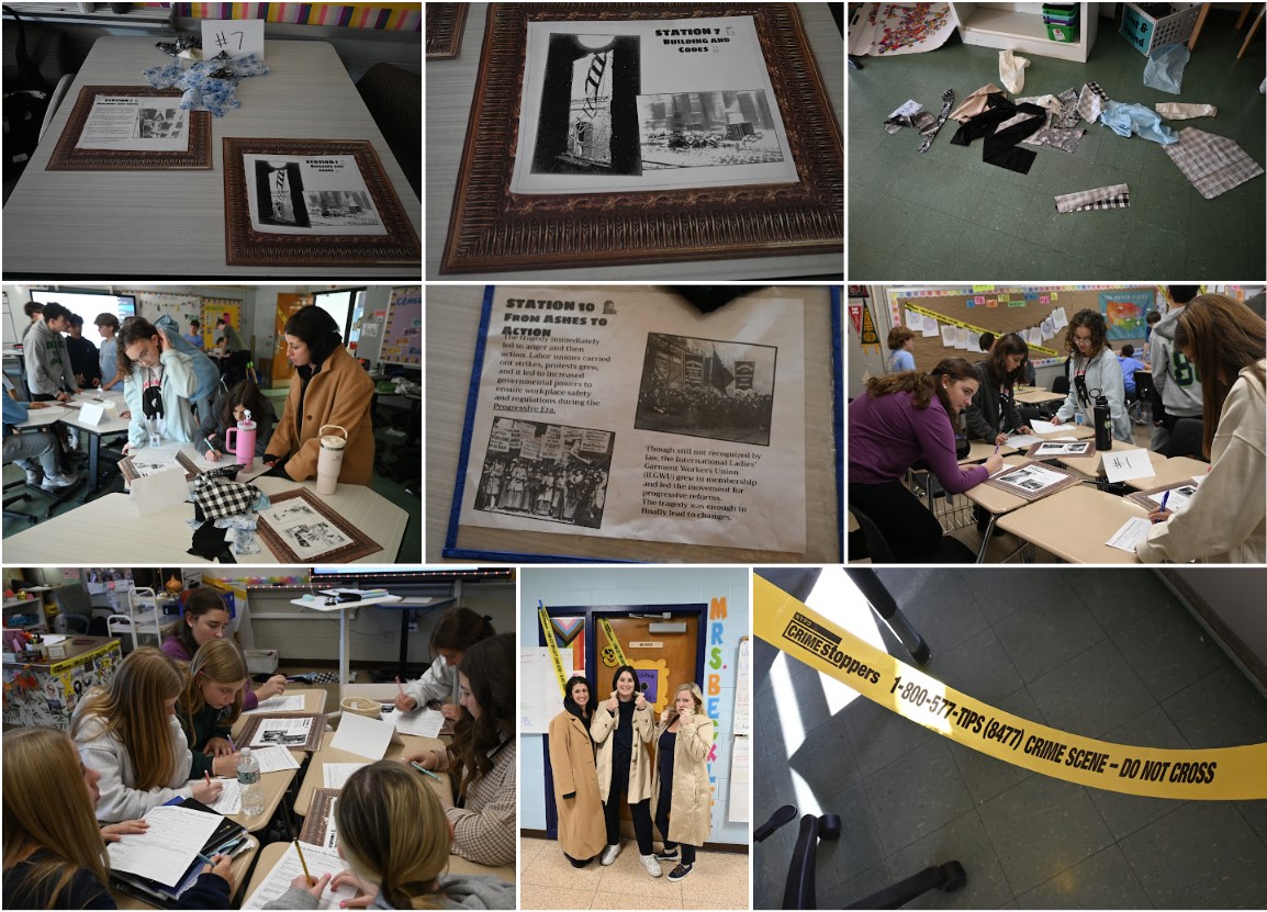 Ms. Beckley, Ms. Briguglio, and Ms. Pierce partnered together for a memorable Social Studies lesson for their 8th grade students last week. Each classroom was set up to mimic a crime scene to teach their students about the tragedy of the Triangle Shirtwaist Factory Fire that took place during the Progressive Era on March 25, 1911 in New York City. It was the deadliest industrial fire killing 146 of its 500 employees.