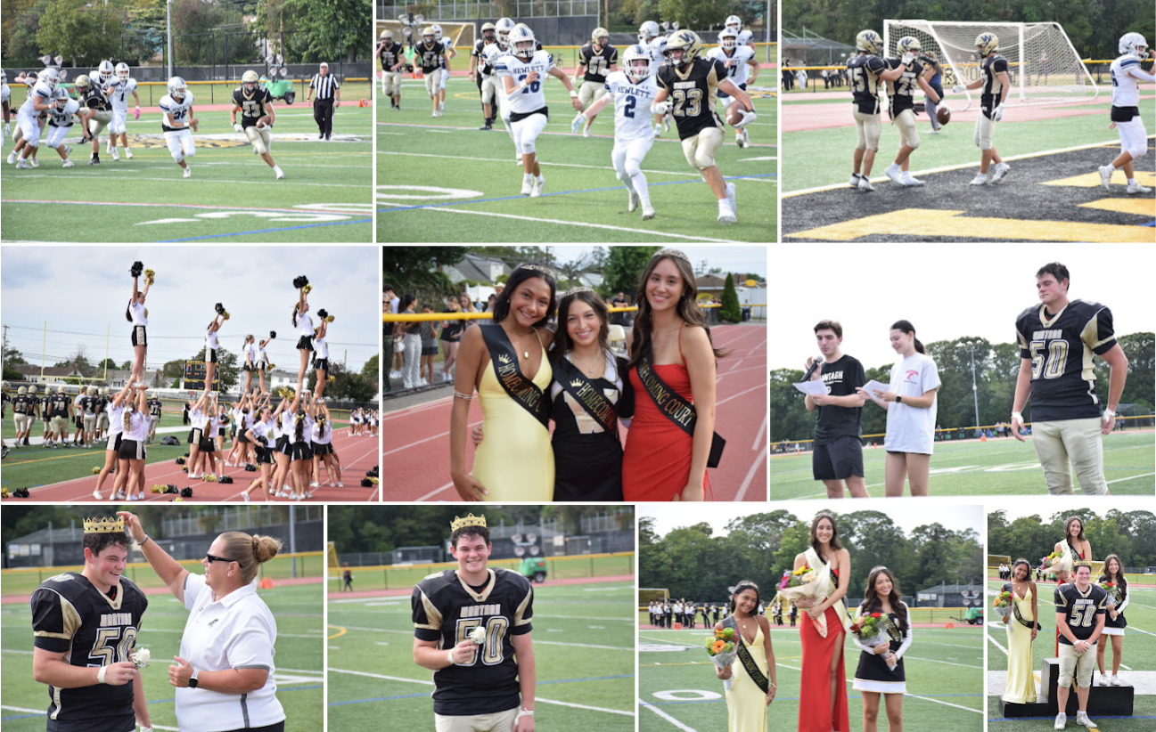 Halftime featured the introduction of the homecoming court, with Ryan Martone and Lana Lee crowned king and queen. Sofia Aufiero and Calaya Encarnacion were the runners-up for queen. General organization co-presidents Danny Donahue and Nina Myers announced the juniors as the winners of the float competition with their fall-themed design. The cheerleaders performed, followed by the marching band and kickline. The band played a snippet of its show for the upcoming Newsday Marching Band Festival, which will feature music from the 1970s, 80s and 90s.